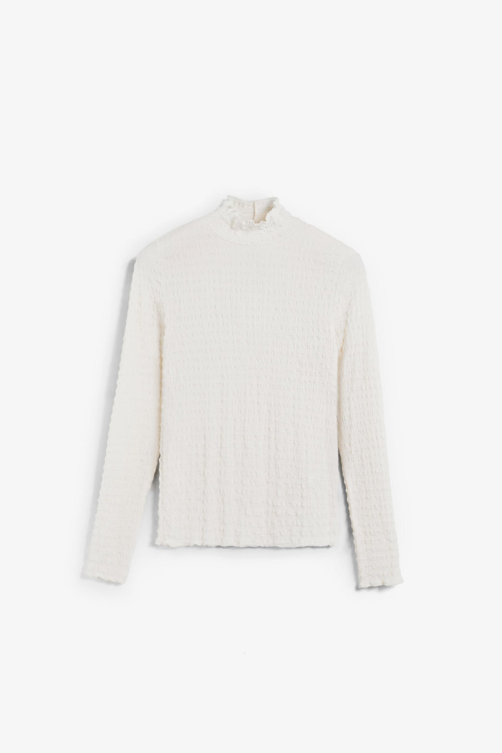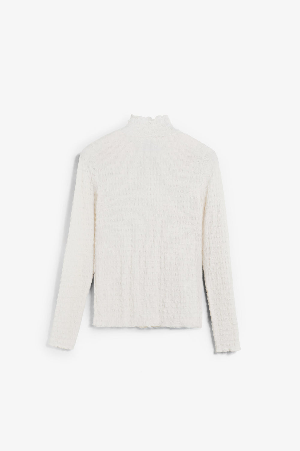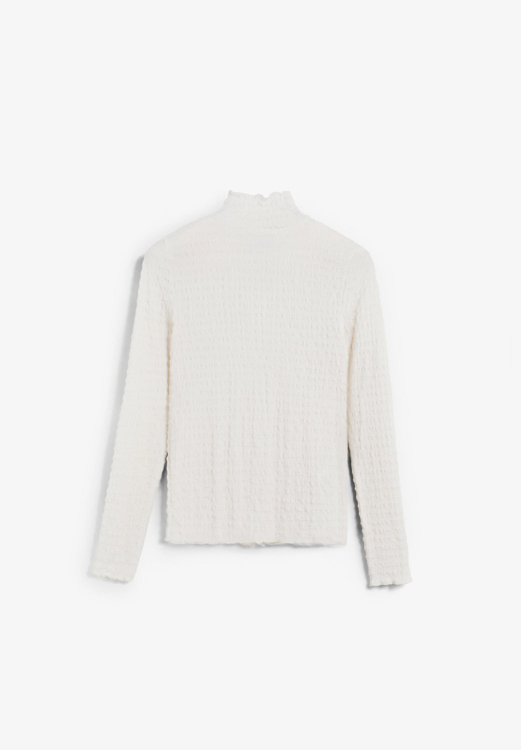 High neck top with long sleeves. Lightweight fabric with gathered texture.
