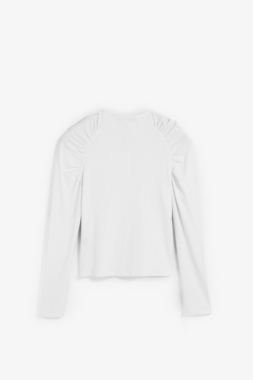 Long sleeve ribbed T-shirt. Gathered detail on the shoulders. Stretch fabric and round neck.
