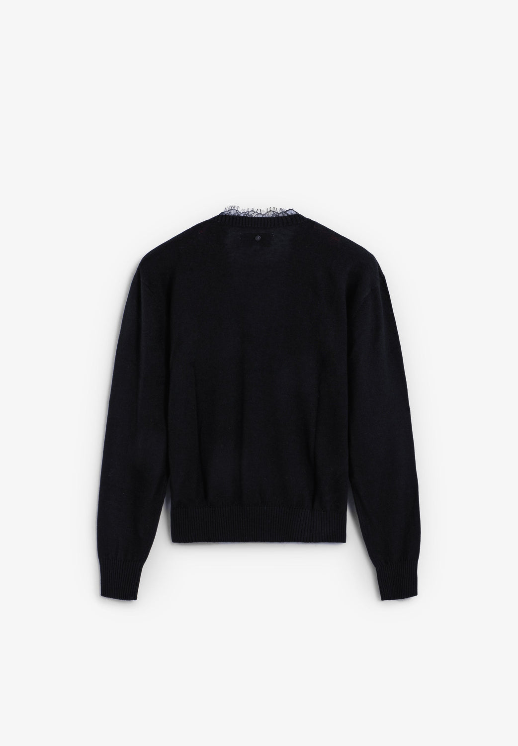 Sweater made of a wool and viscose blend. Regular fit. V-neck with lace details. Long sleeves with ribbed cuffs and hem.