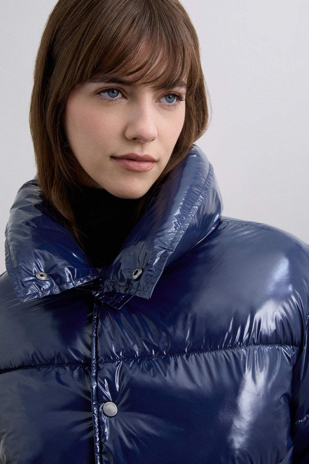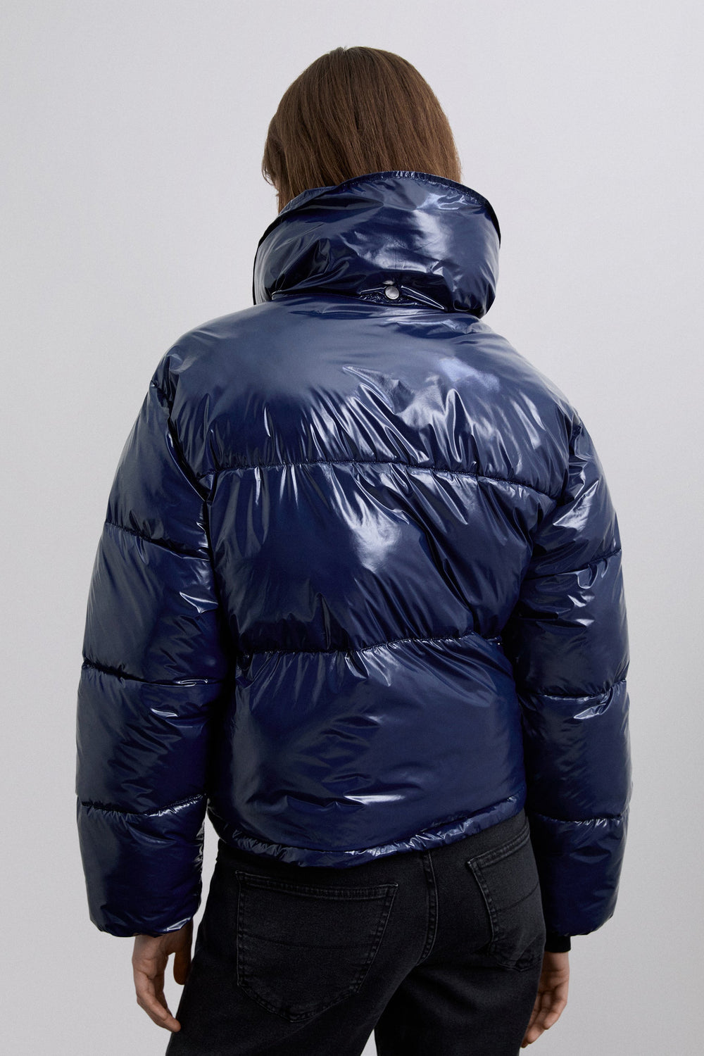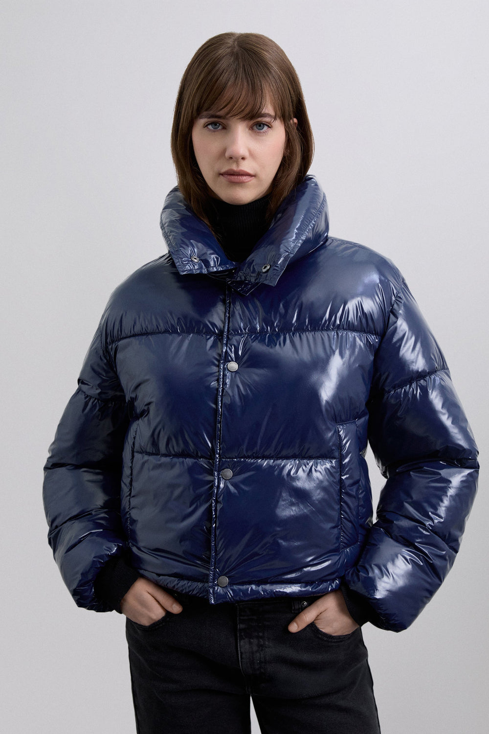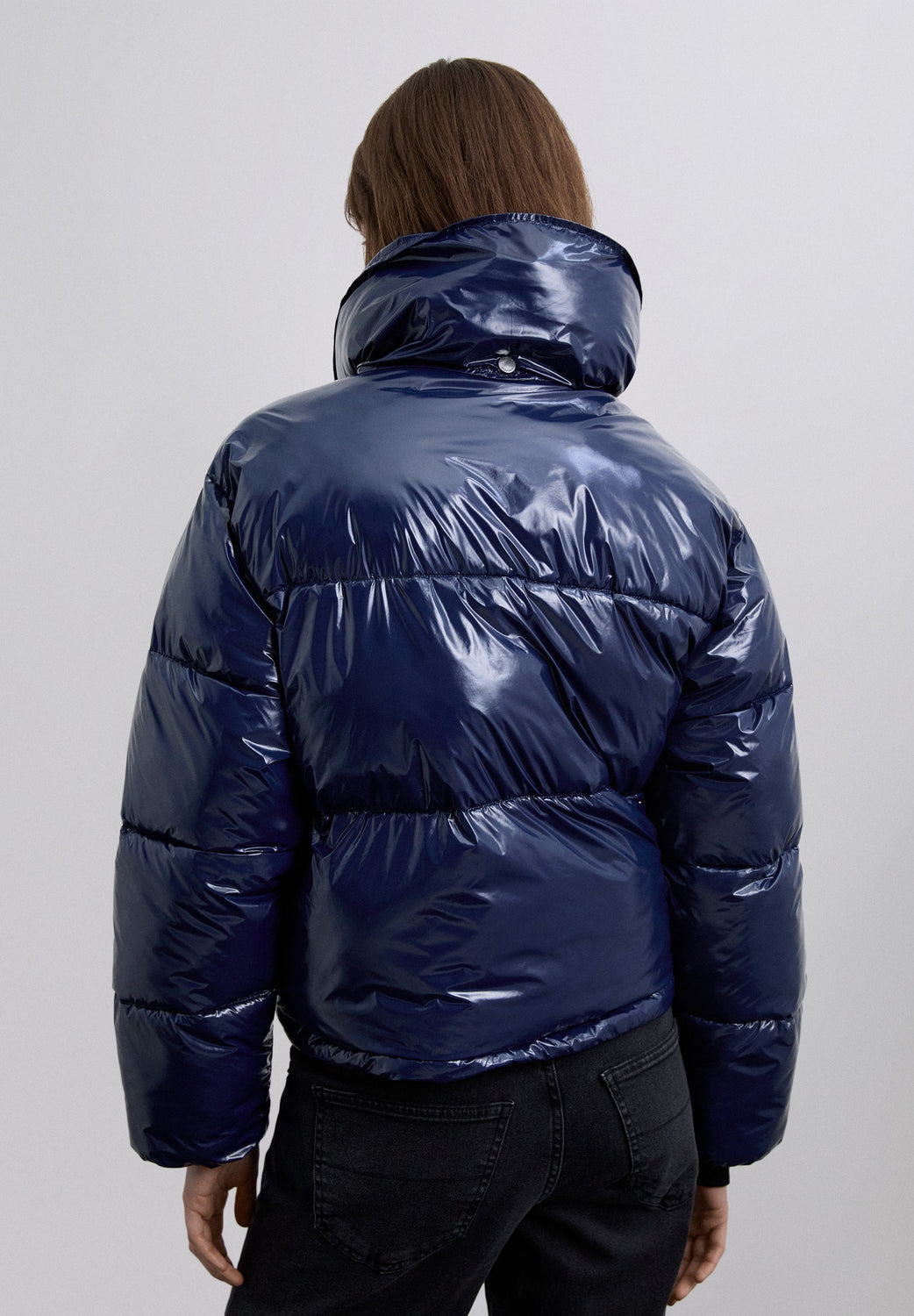Quilted down jacket made of nylon with shiny finish. Regular fit. High collar. Long sleeves. Side slant pockets. Snap button fastening.