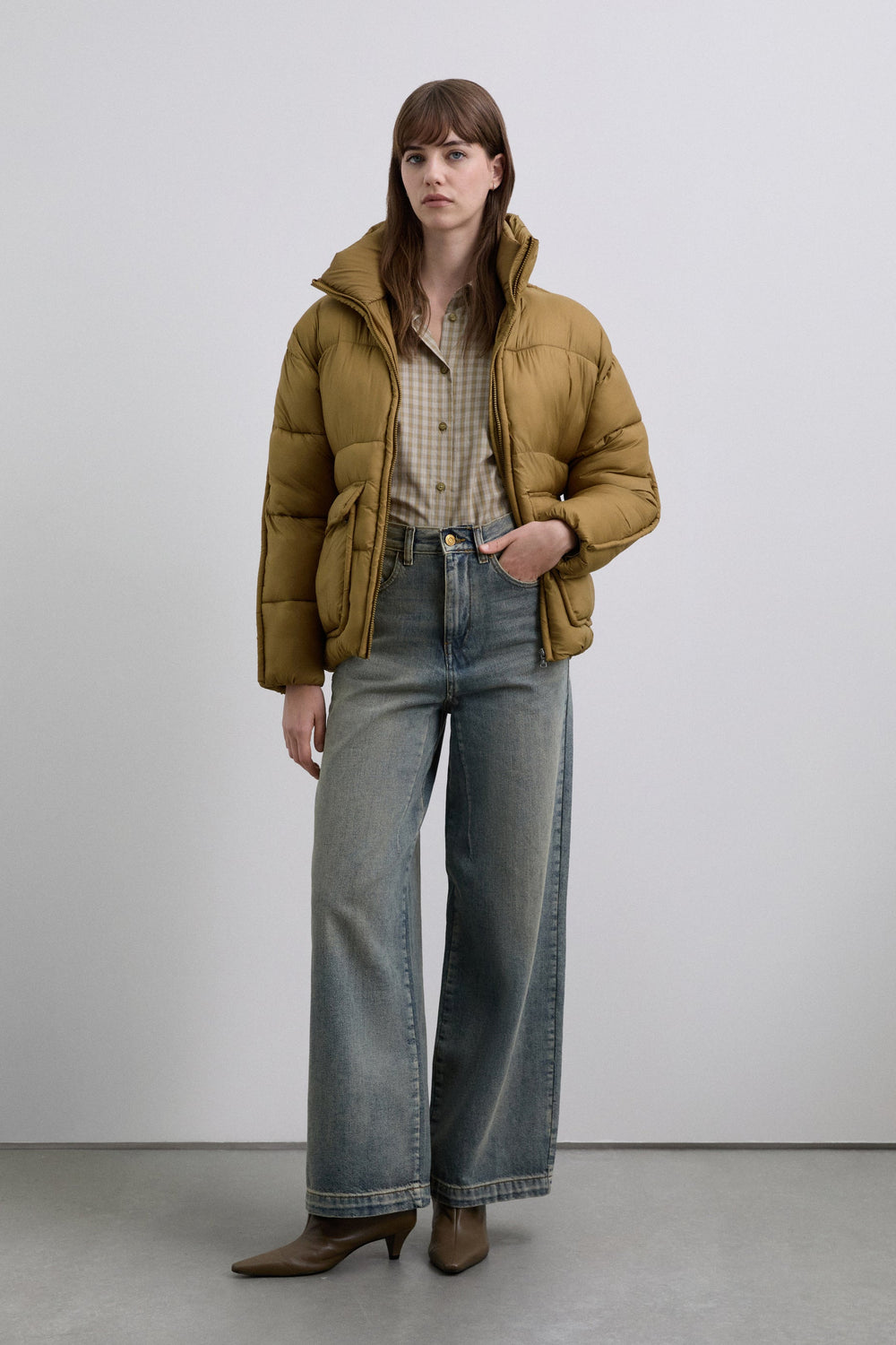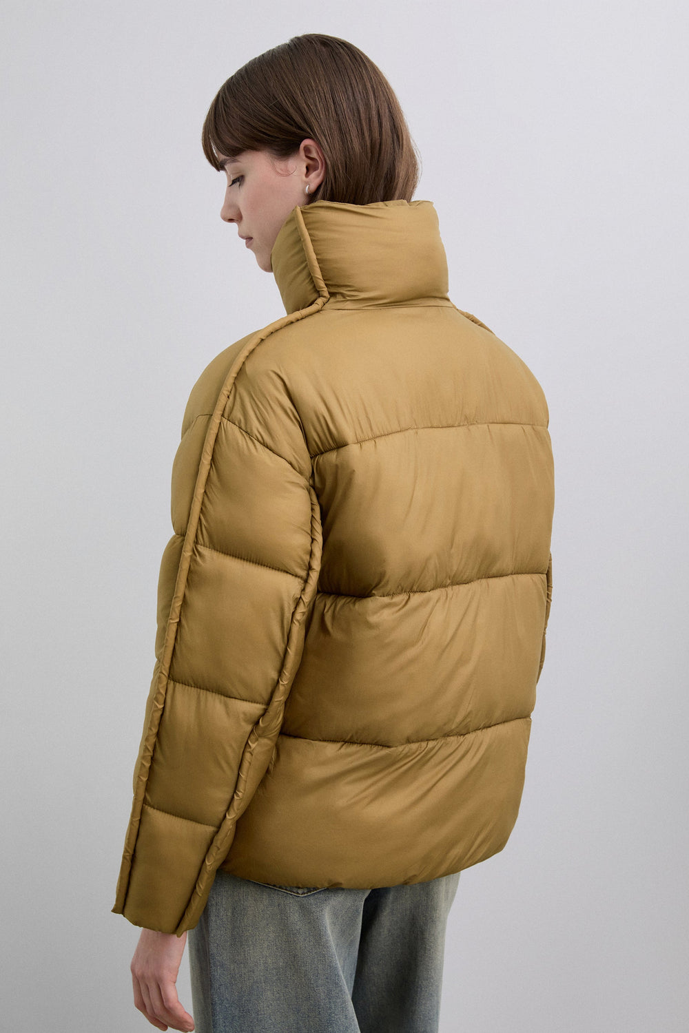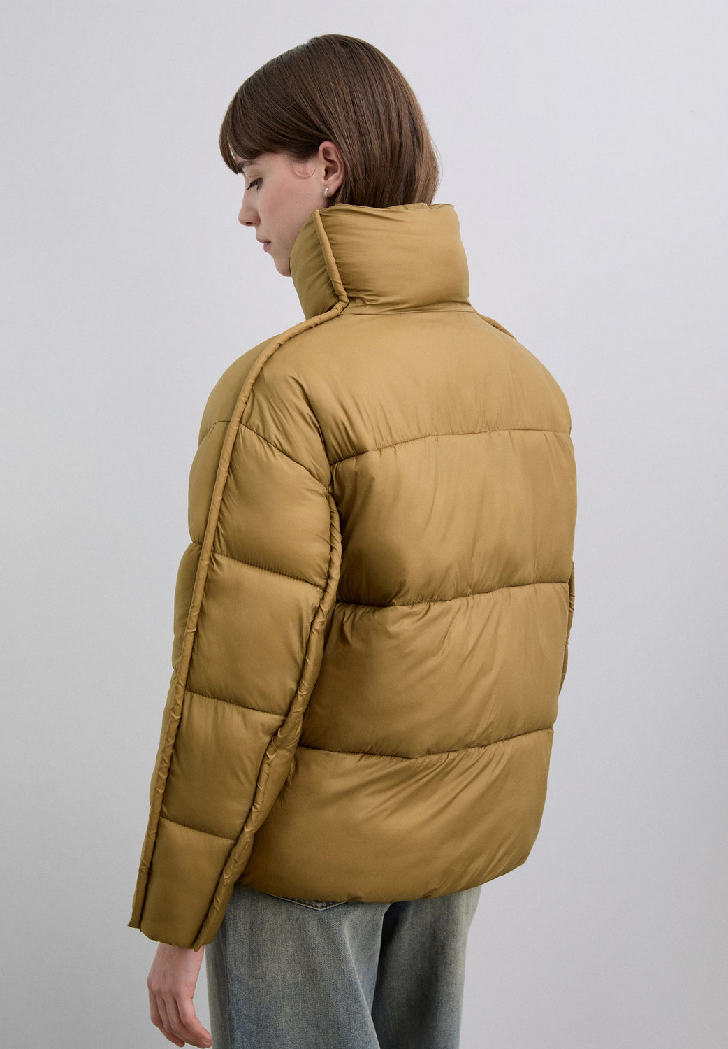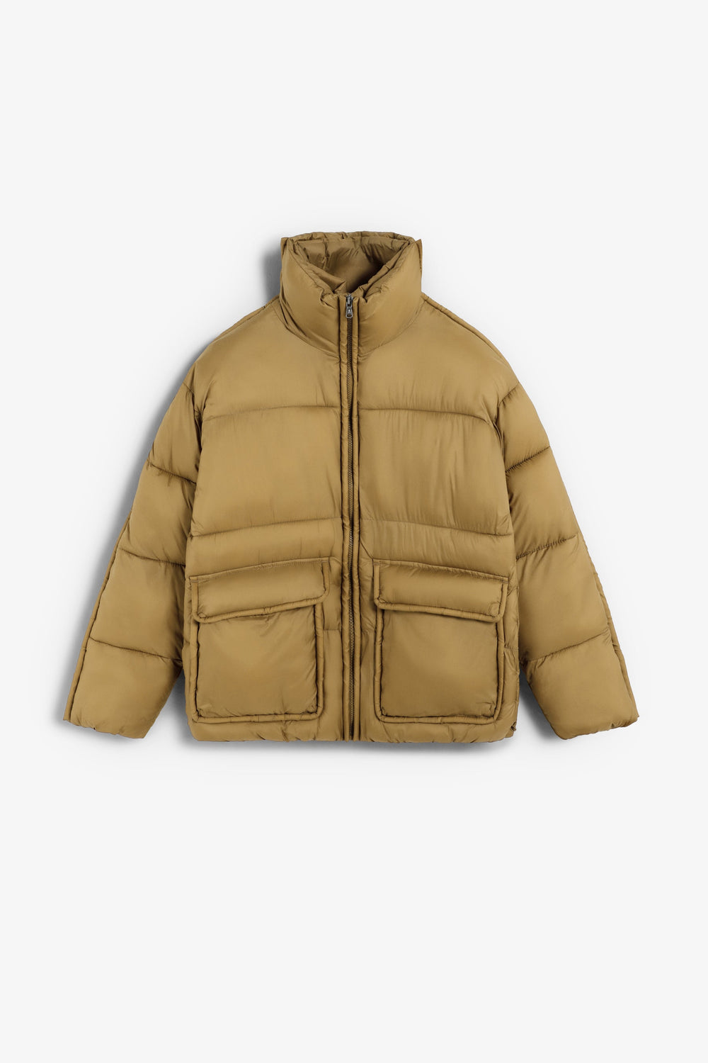 Puffer jacket with front pockets. Front zip fastening. High neck and long sleeves.