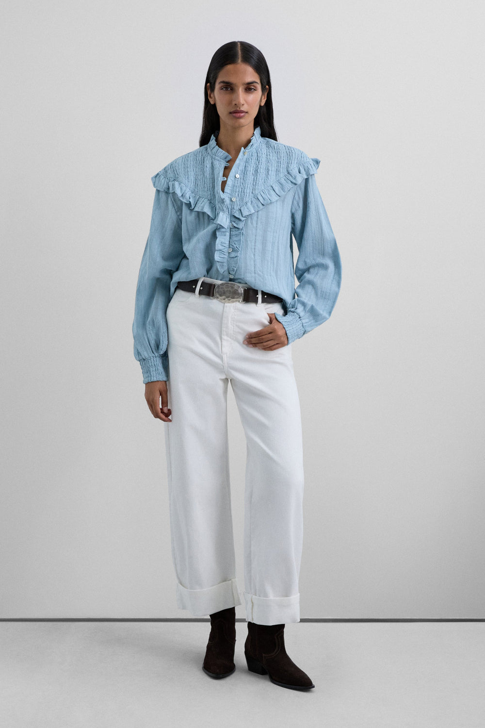 Long sleeve blouse made of 100% cotton. Classic collar and ruffle in smocked fabric. Mother-of-pearl buttons.