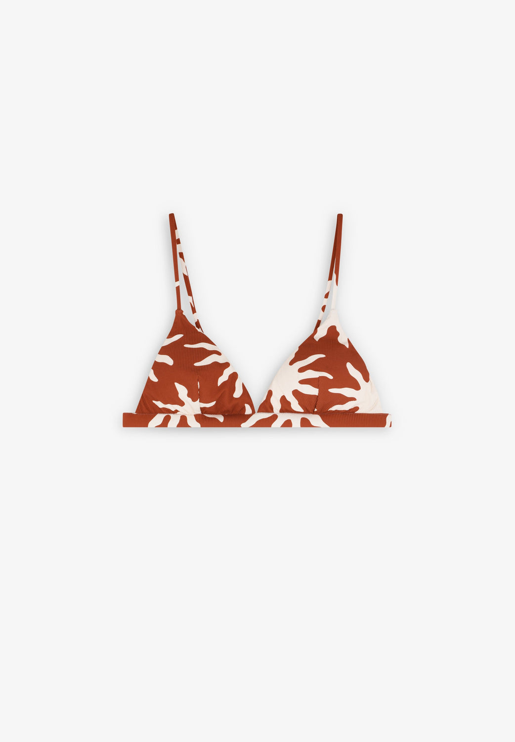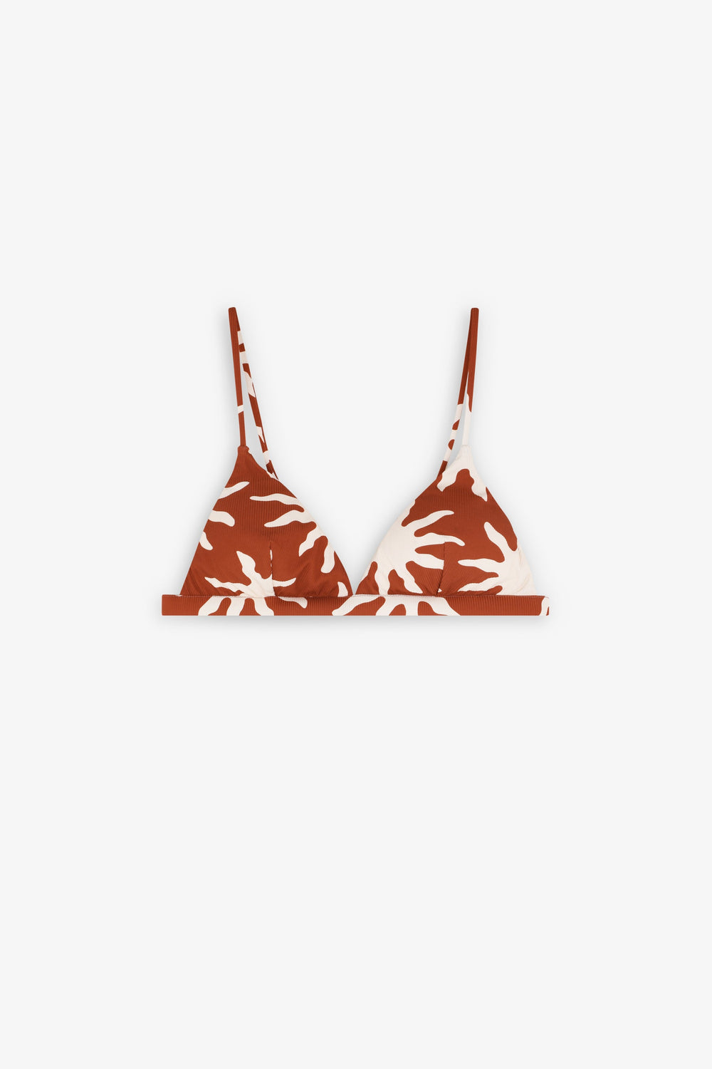 This bikini is designed in collaboration with Scalpers and belongs to the ROBIN x SCALPERS collection. This is a triangle bikini with sun print in ecru on a terracotta background in a ribbed structure. With removable foam pads and chest strap. Adjustable shoulder straps and a multi-position hook-and-eye fastening at the back for a better fit. High-cut, fully lined bottom.
