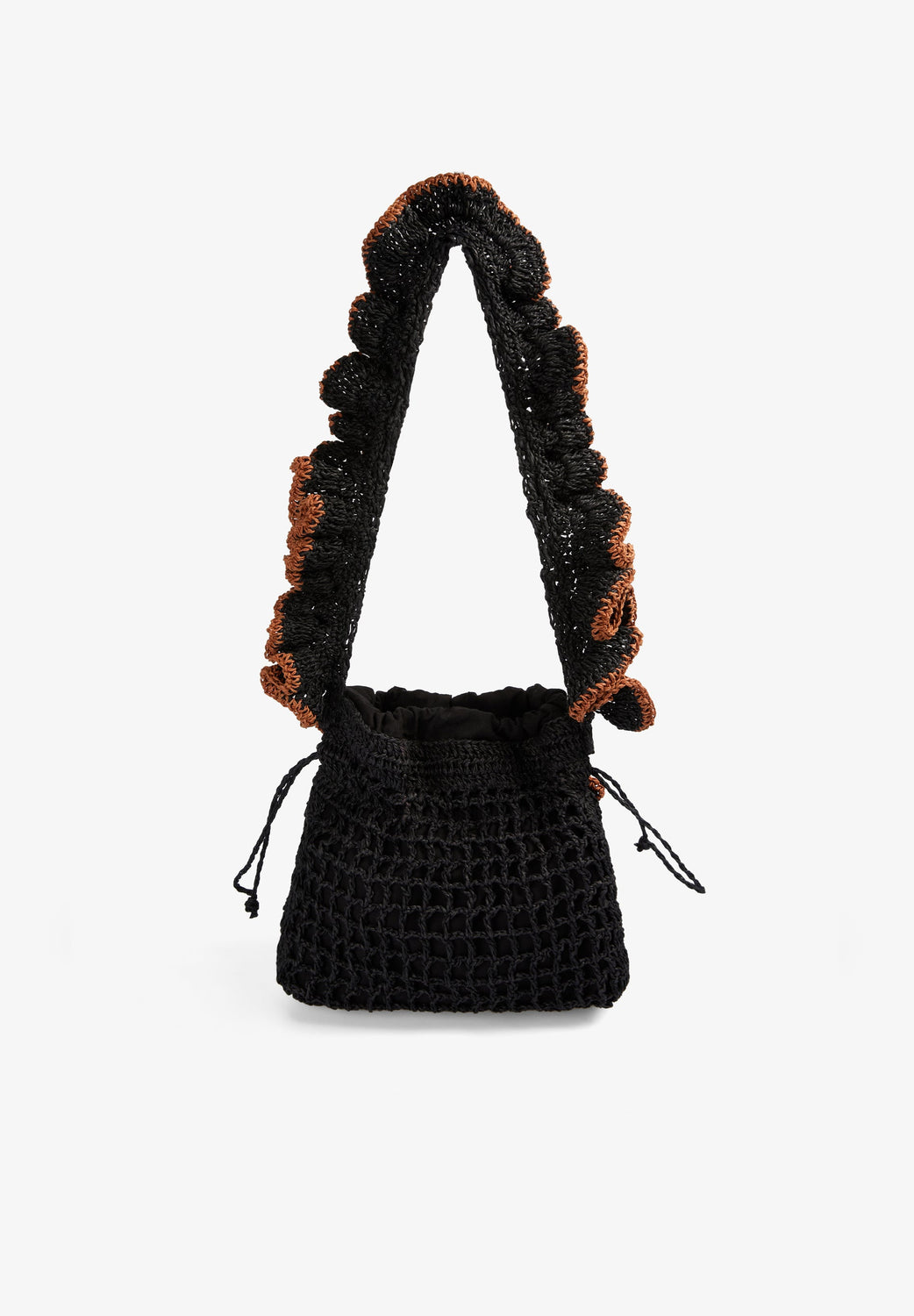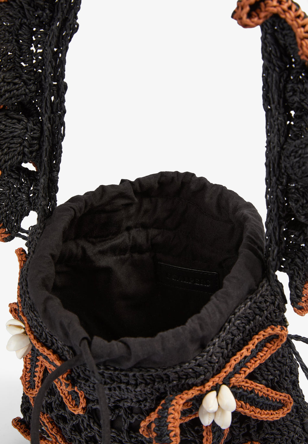 Raffia bag with contrast flowers and decorative shells. Gathered handle detail. Adjustable drawstring closure.