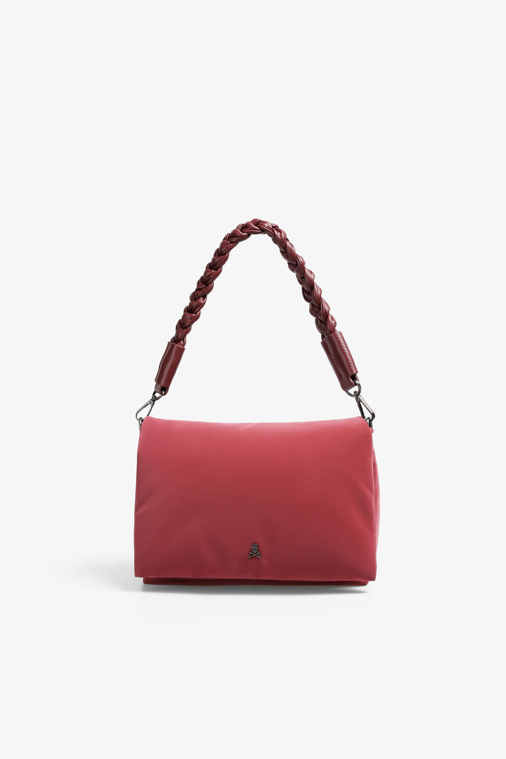 Bag made of polyurethane. Magnetic button fastening. Short braided handle with metallic details and long adjustable strap. Metallic patch with skull on front. Inner lining and pocket with zip closure and logo detail.