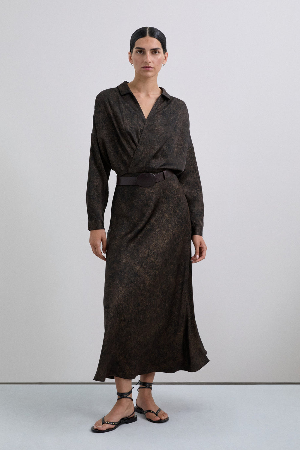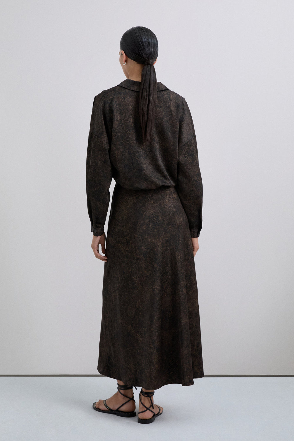 Flowing fabric skirt with satin finish. Marbleised effect print. Regular fit. Midi cut. Concealed side zip fastening.