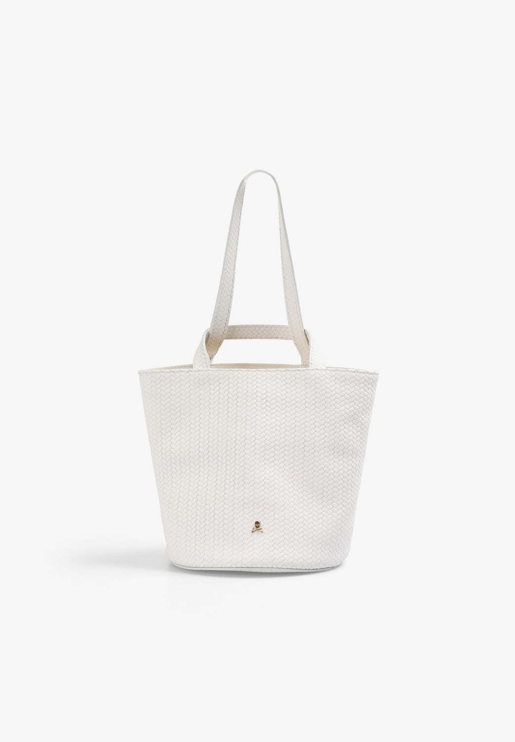 Bucket bag made of braided 100% leather. Inner lining with zipped pocket. Rubberised logo detail on the front. Short strap.