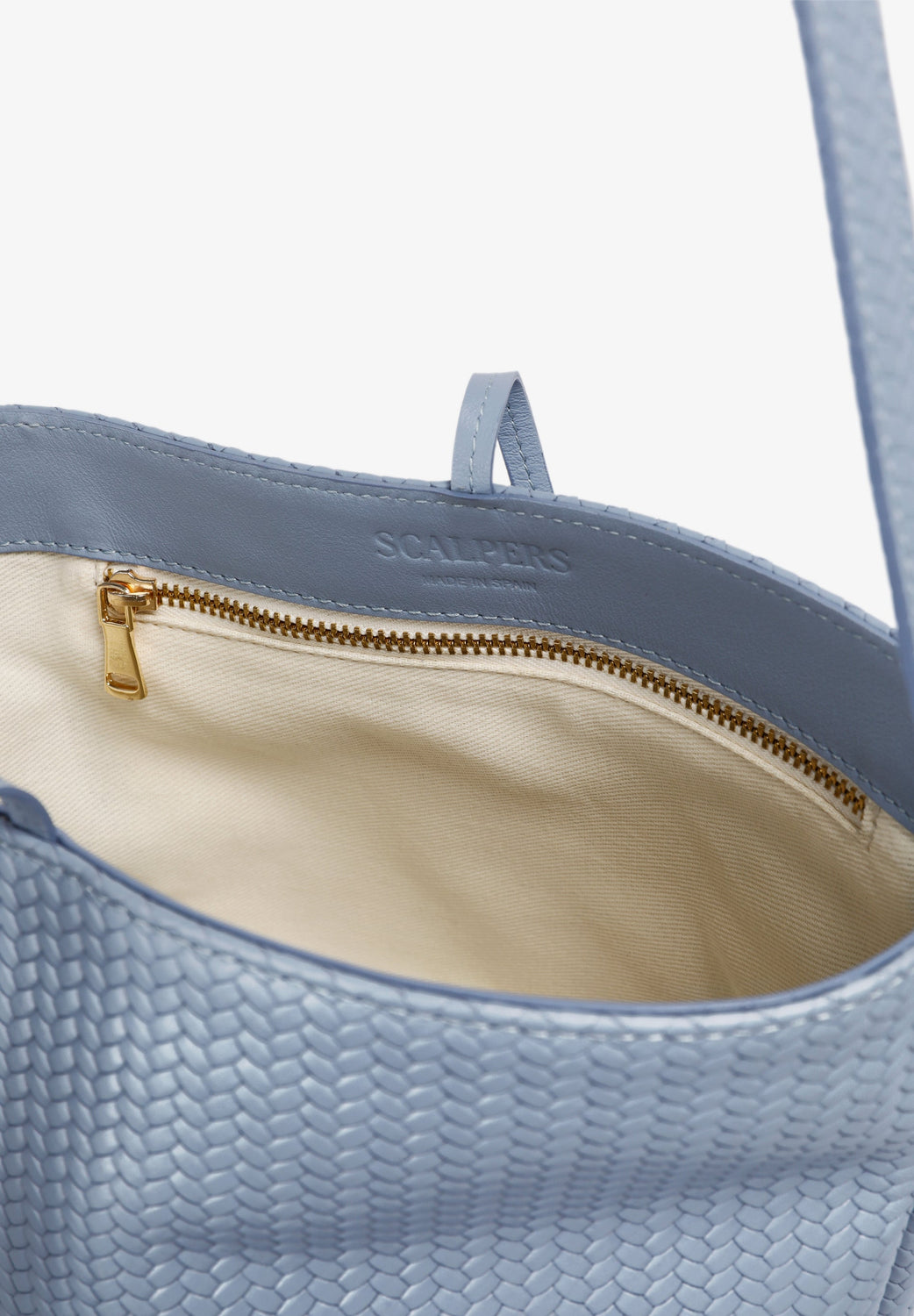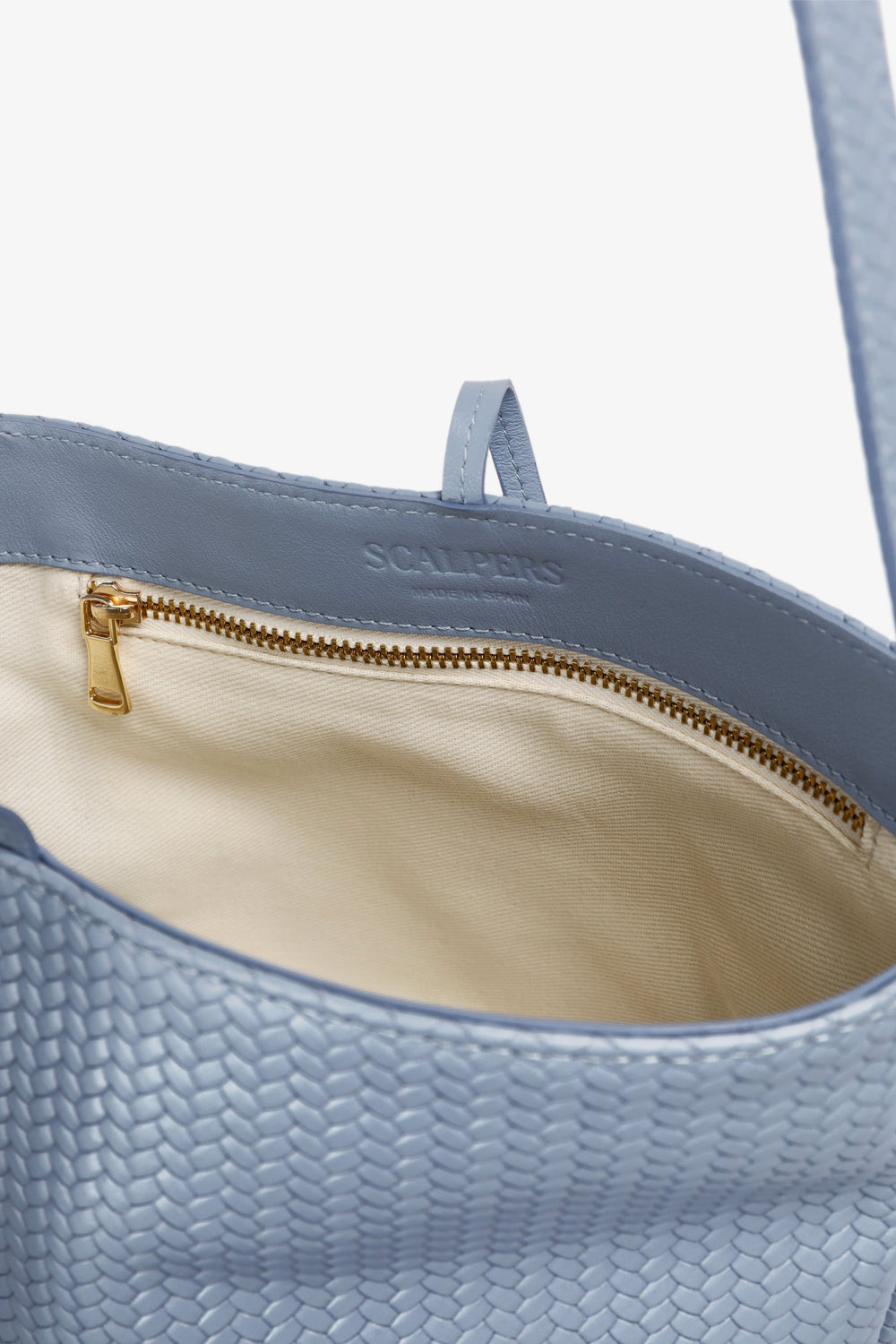 Bucket bag made of braided 100% leather. Inner lining with zipped pocket. Closes with adjustable straps. Long strap. Rubberised logo detail on the front.