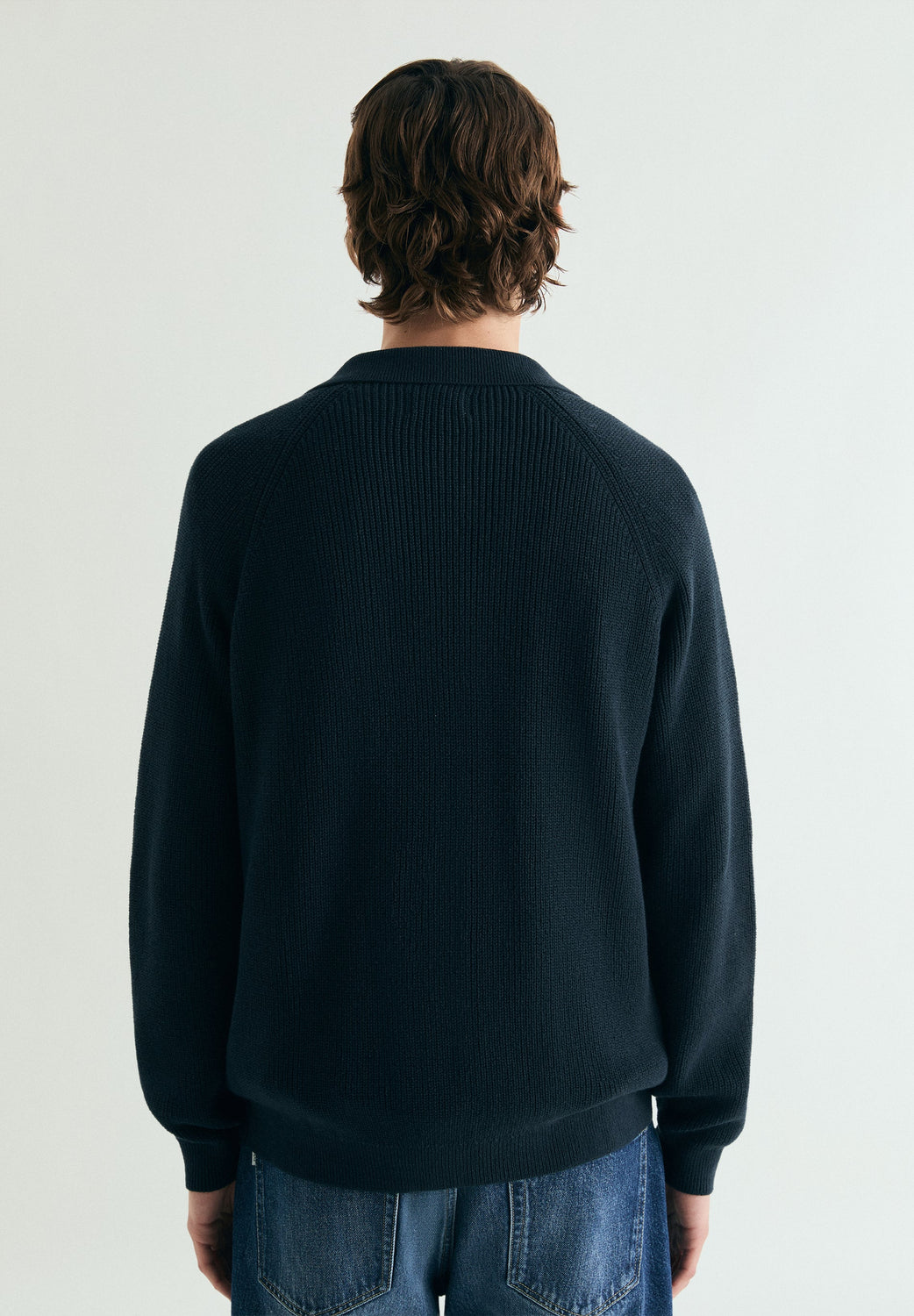 Cardigan made of a cotton and linen blend. Raglan sleeves. Polo shirt collar. Patch pockets. Front button fastening.