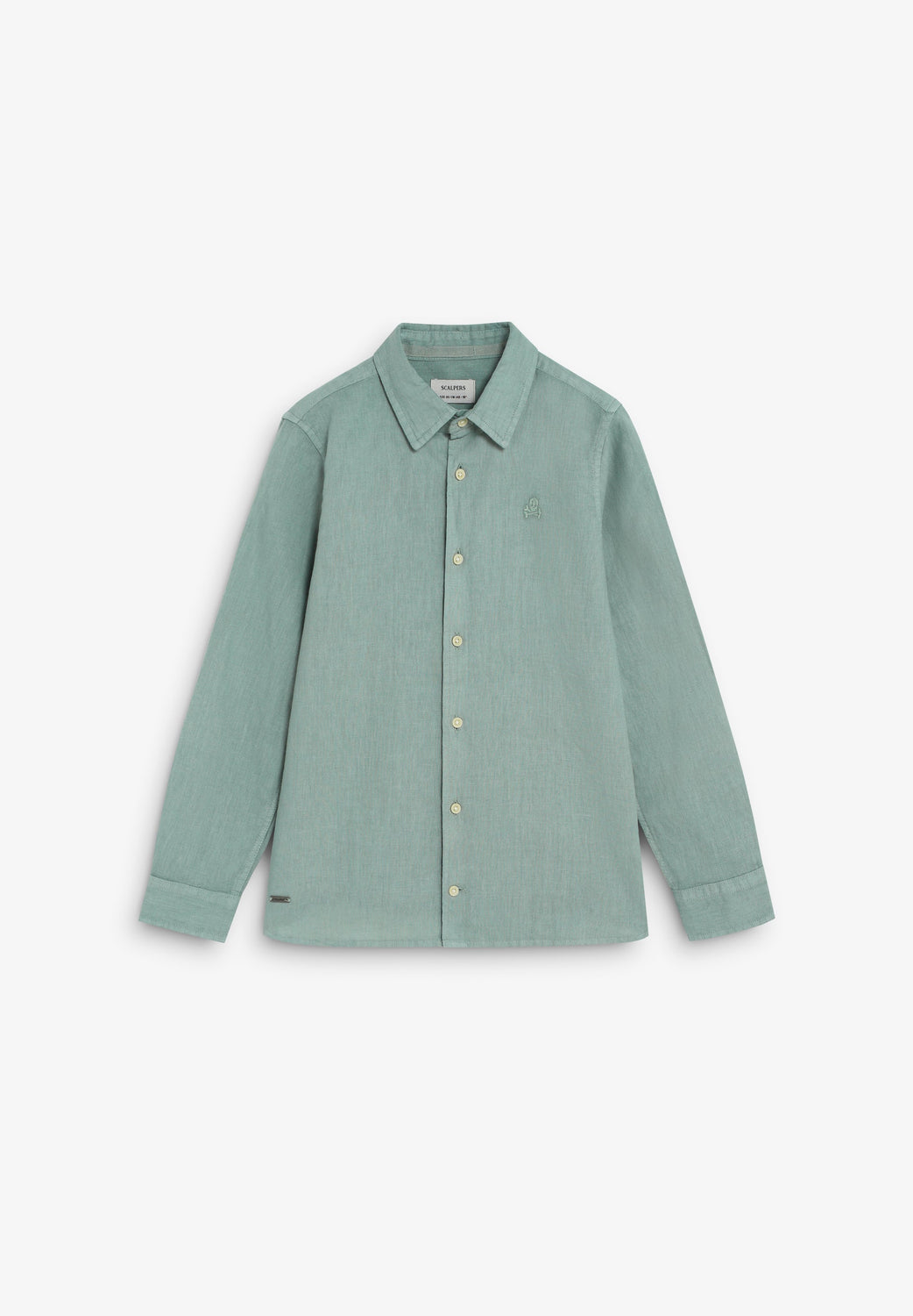 Made of a BCI cotton and linen blend. Classic collar and front button fastening. Matching embroidered skull on the chest. Regular fit with buttoned cuffs. Metal tag detail with logo at the bottom.