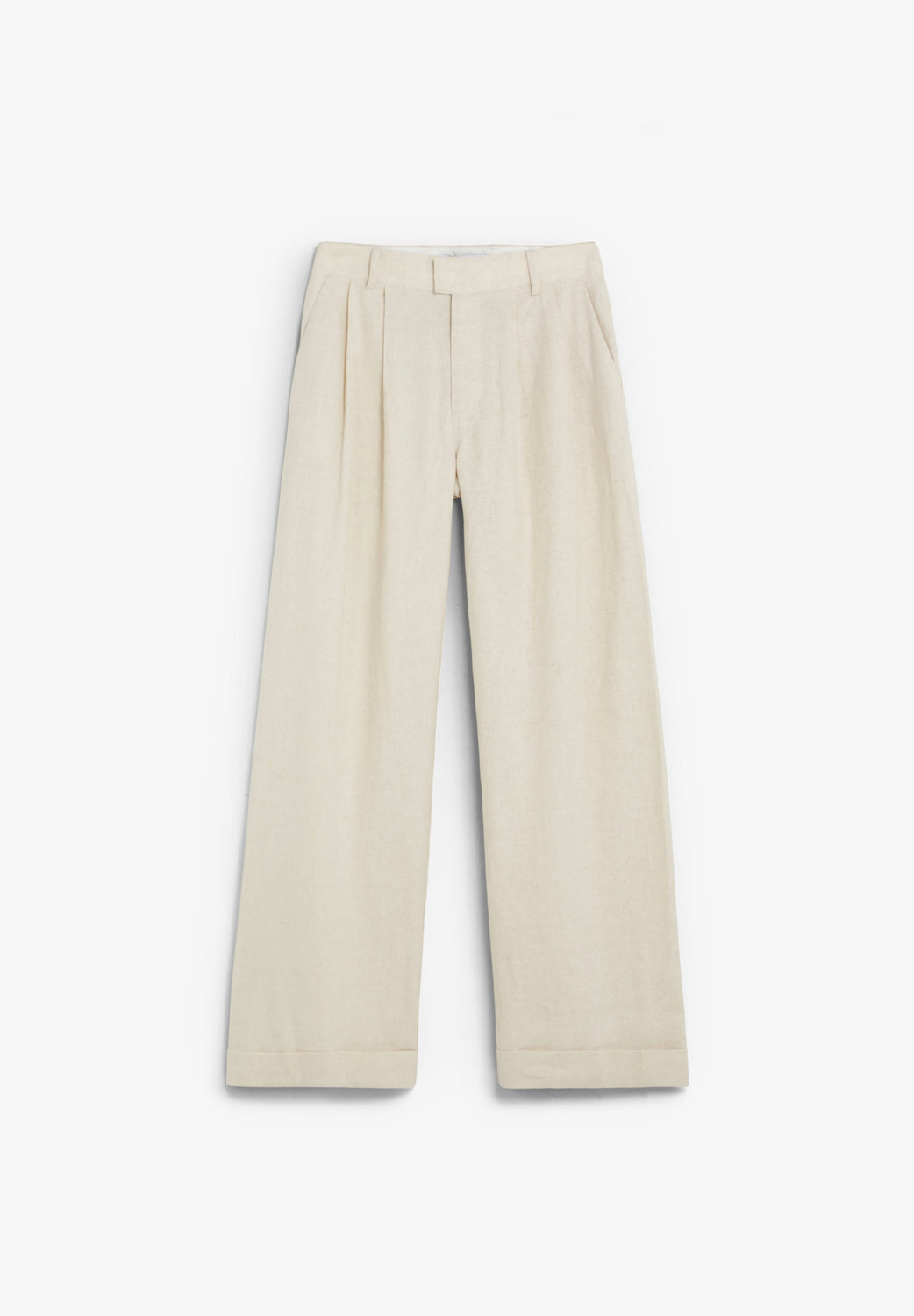 Trousers made of a linen blend. Loose fit. Front darts. Belt loops, zip and slightly offset hook and eye fastening. Back welt pockets.
