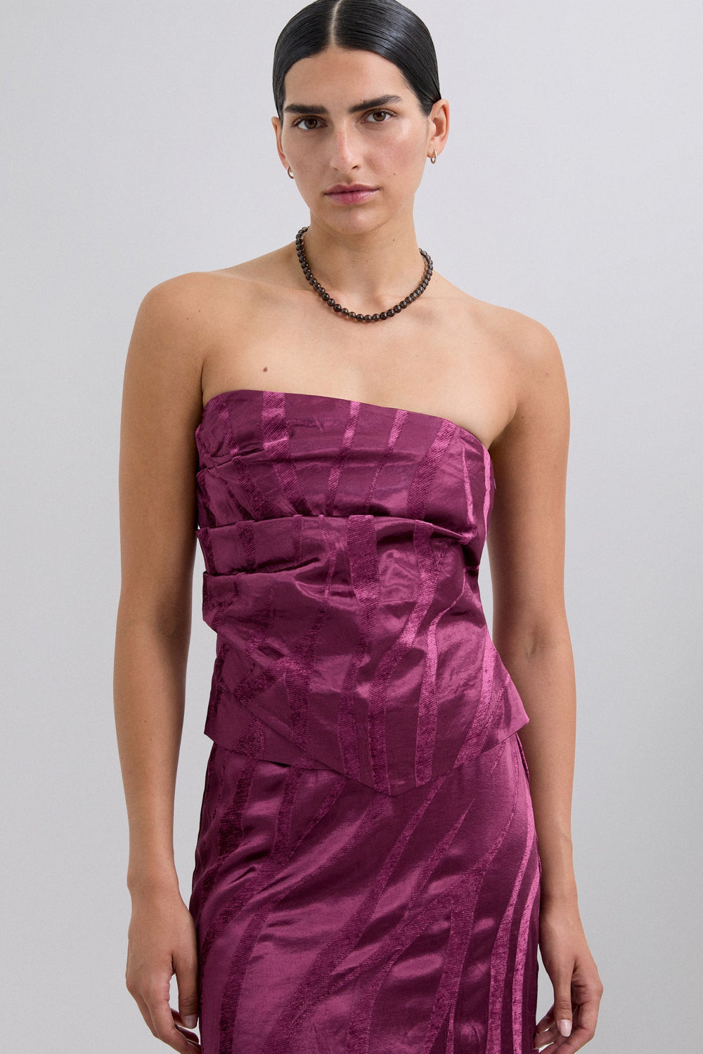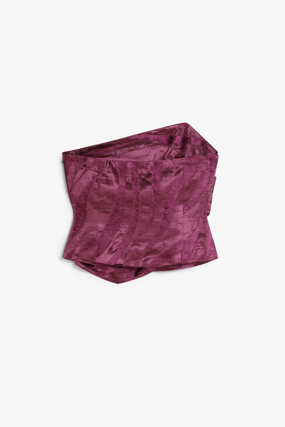 Bandeau top with asymmetric neckline and hem. Jacquard print. Double layer. Pleats on one side.