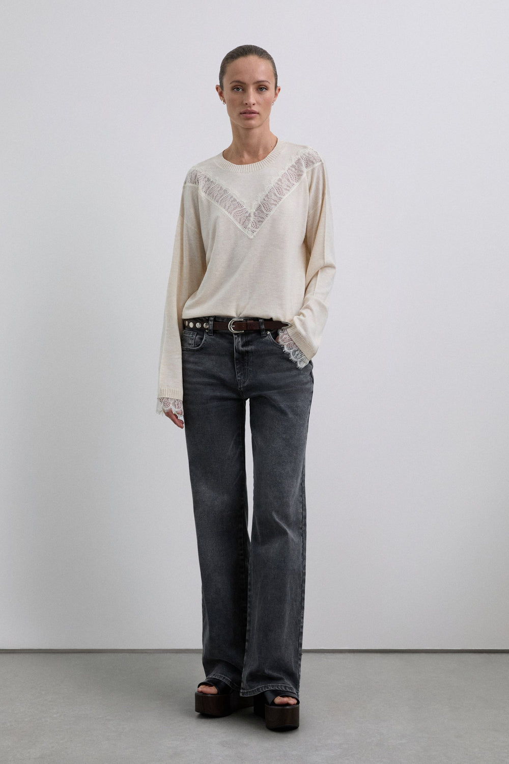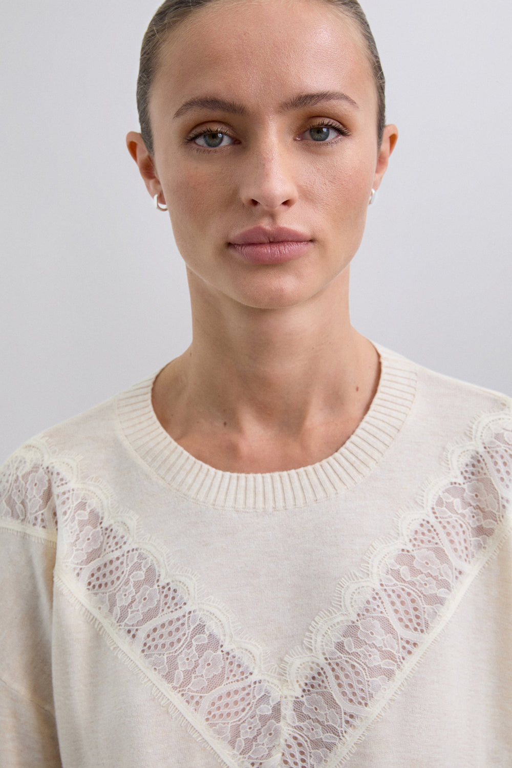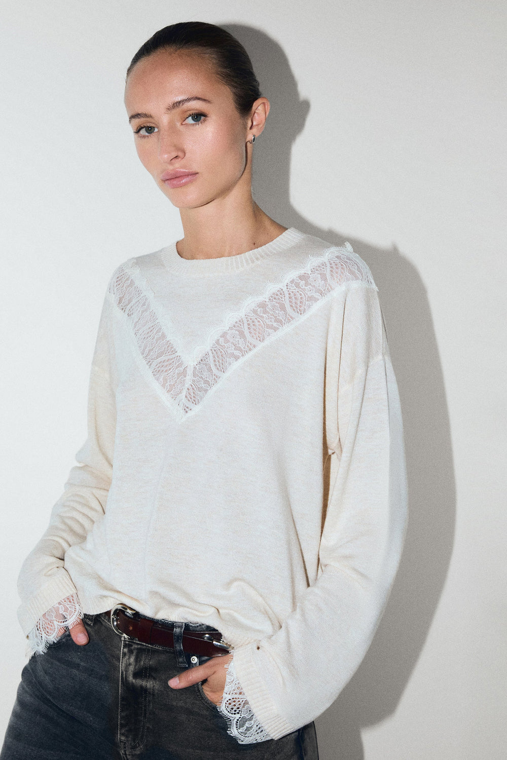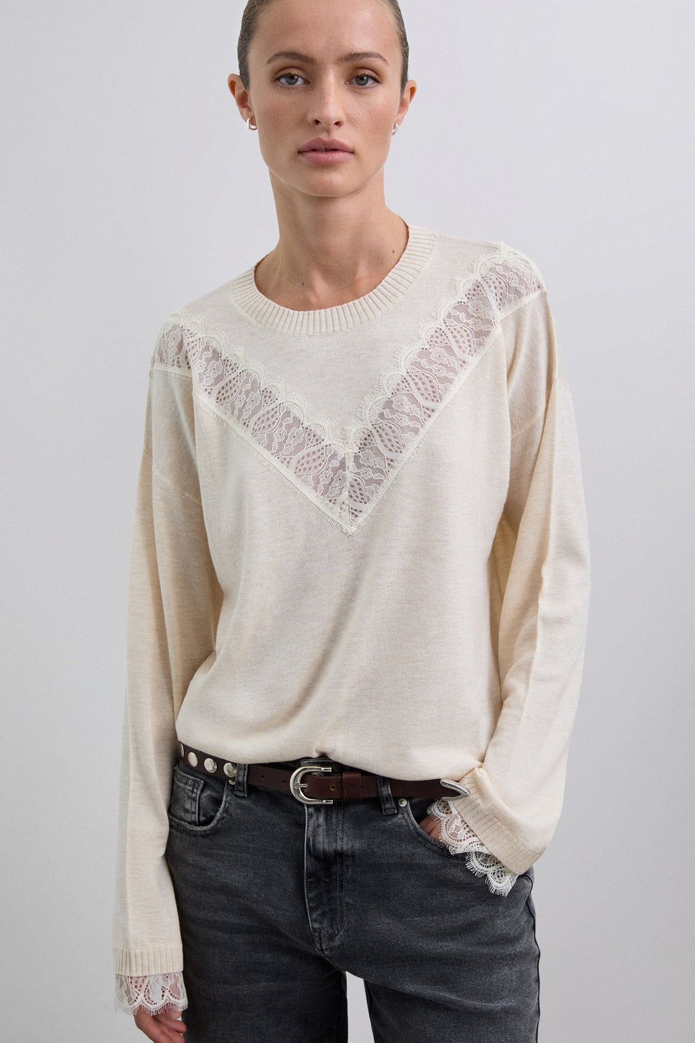 Sweater made of a wool and viscose blend. Regular fit. Round neck and long sleeves with ribbed trim. Lace details on chest and cuffs.