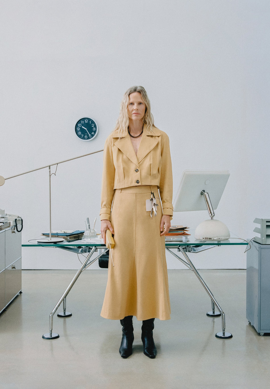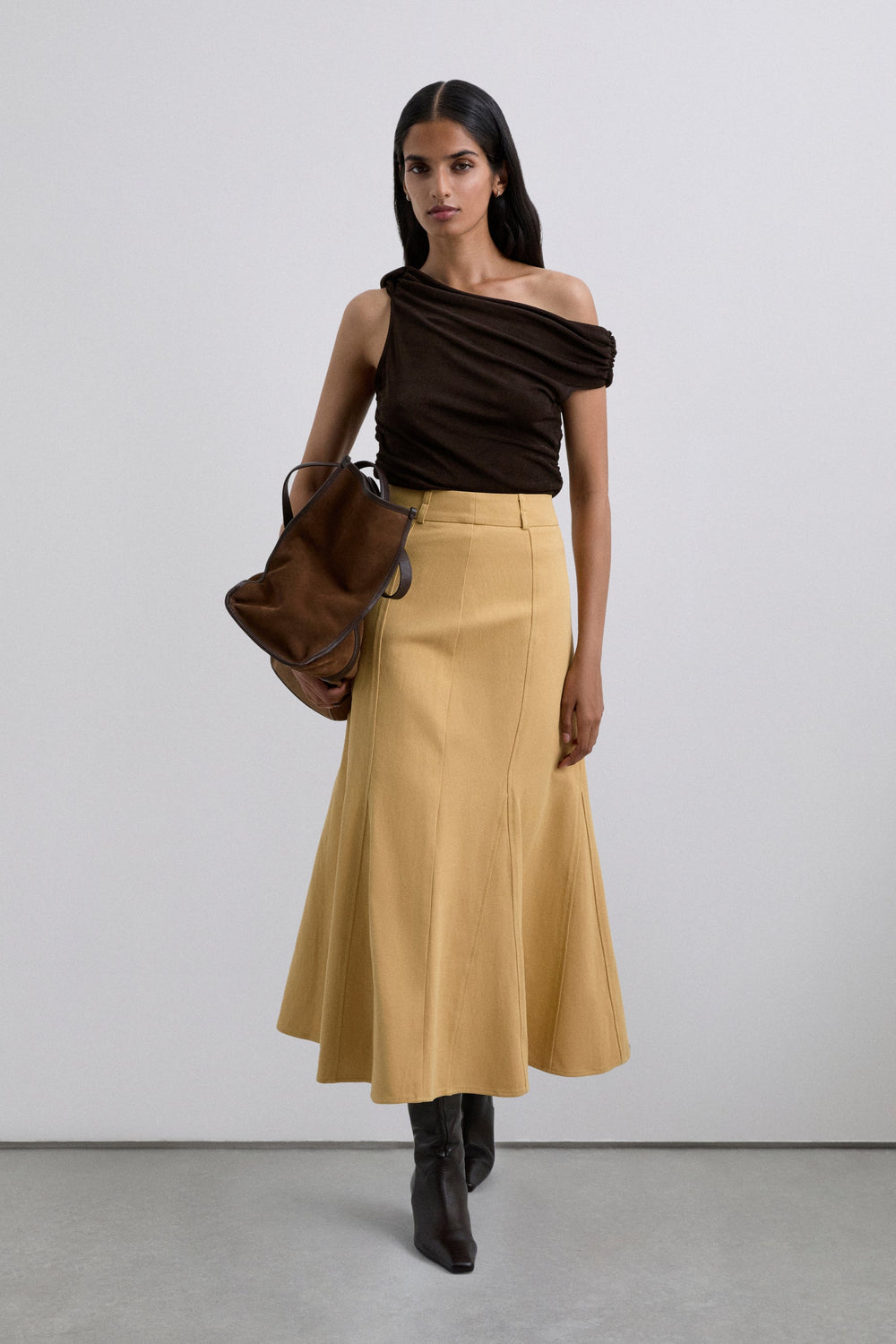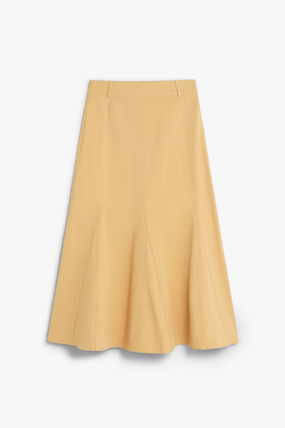 100% cotton skirt with belt loops, elasticated waist and pleats. Matching lining. Side fastening with concealed zip.