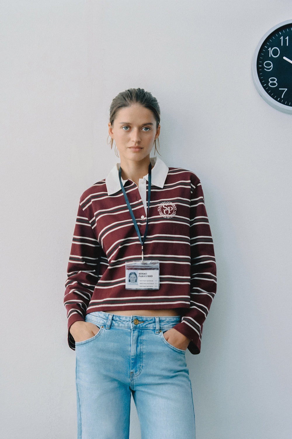 Polo shirt in 100% BCI cotton. Stripe print. Long sleeves. Contrasting collar. Button fastening. Embroidered contrast logo on the chest.