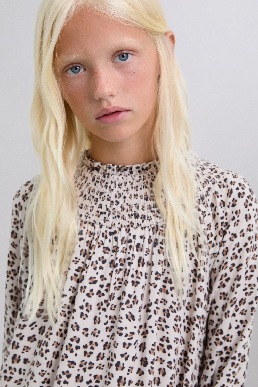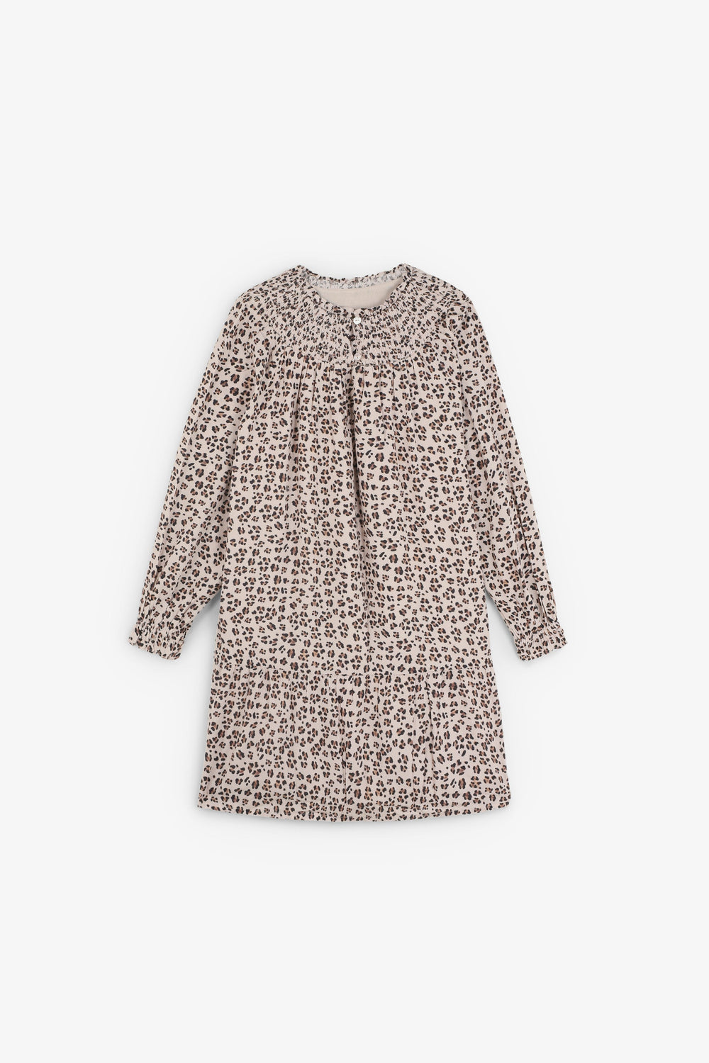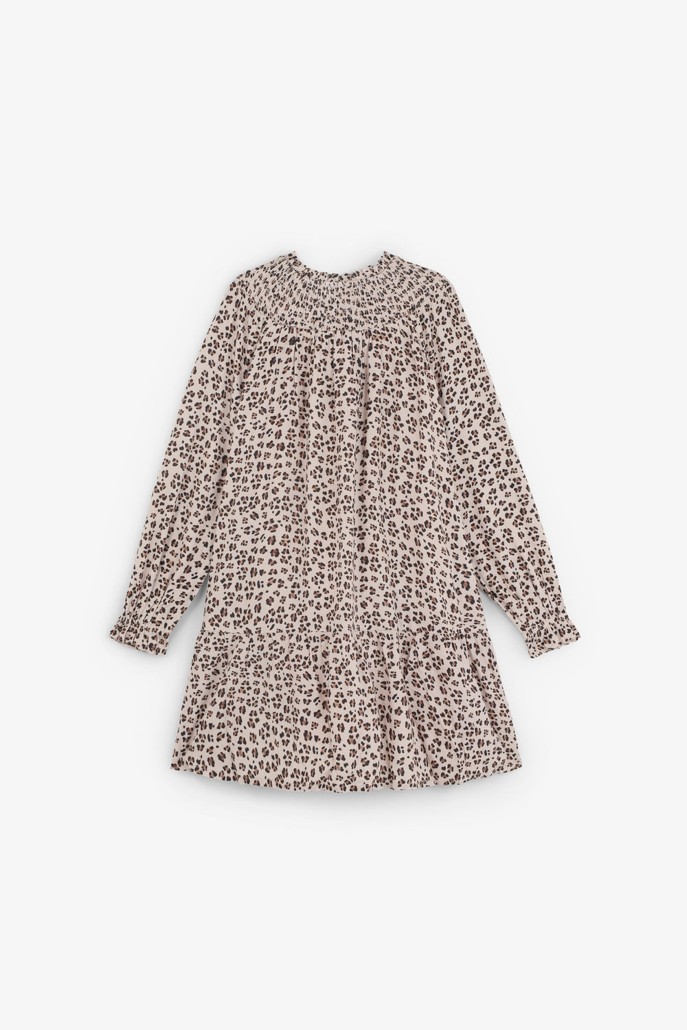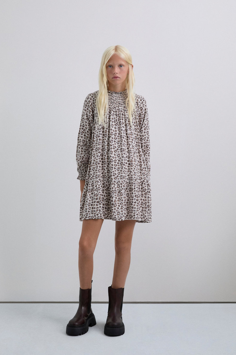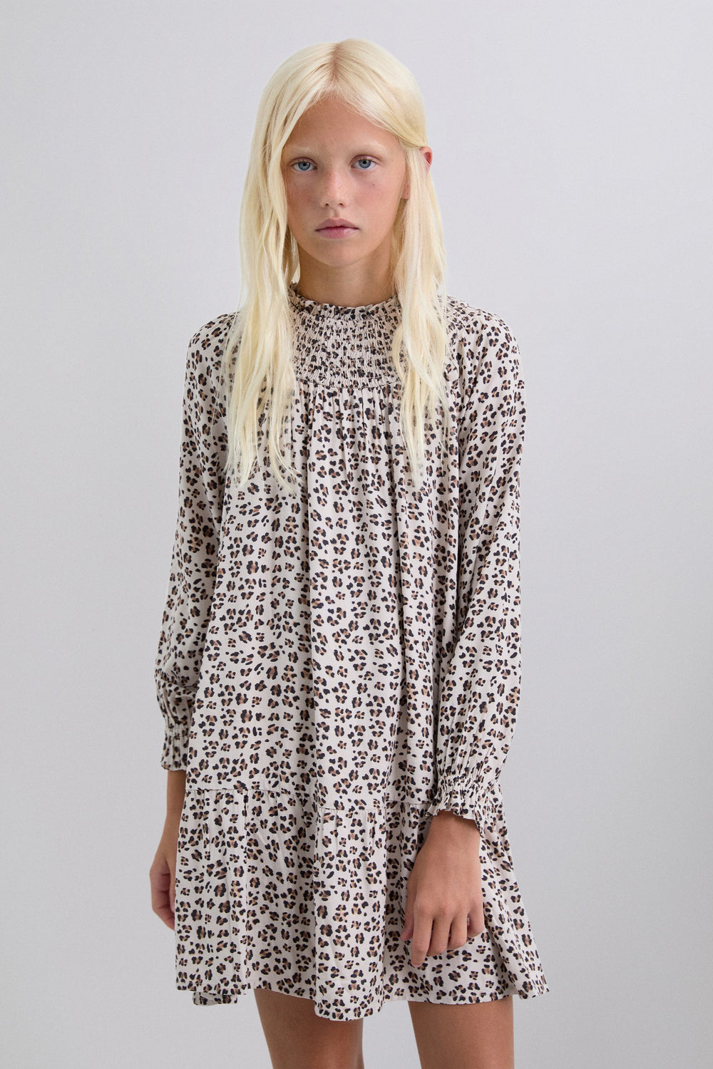 Mini dress made of 100% viscose. Animal print. Slightly puffed long sleeves. Smocked collar.