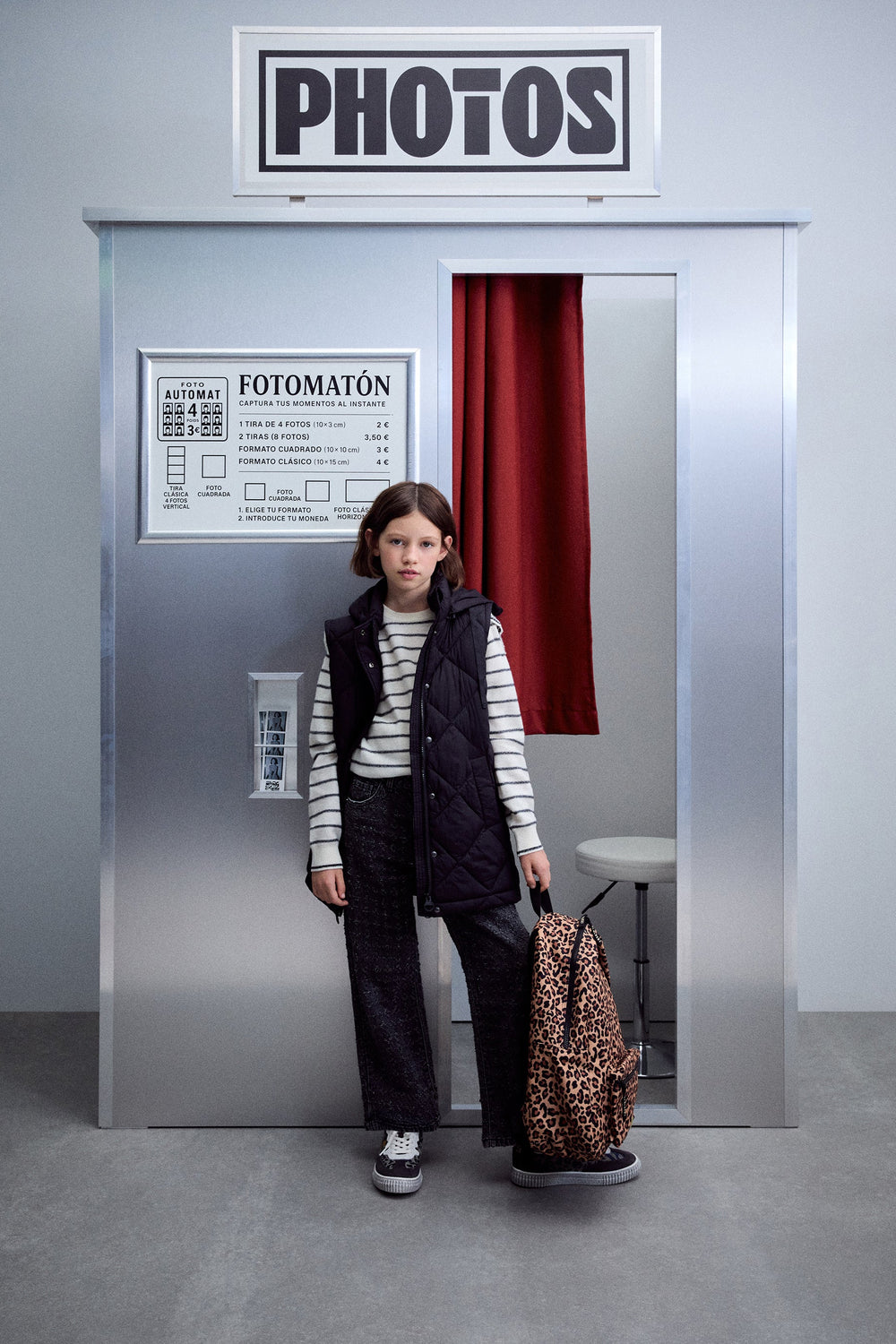 Padded coat. Detachable hood and sleeves. Front zip fastening concealed by placket with press stud fastening. Side pockets. Recycled fleece lining. Logo detail on the back.