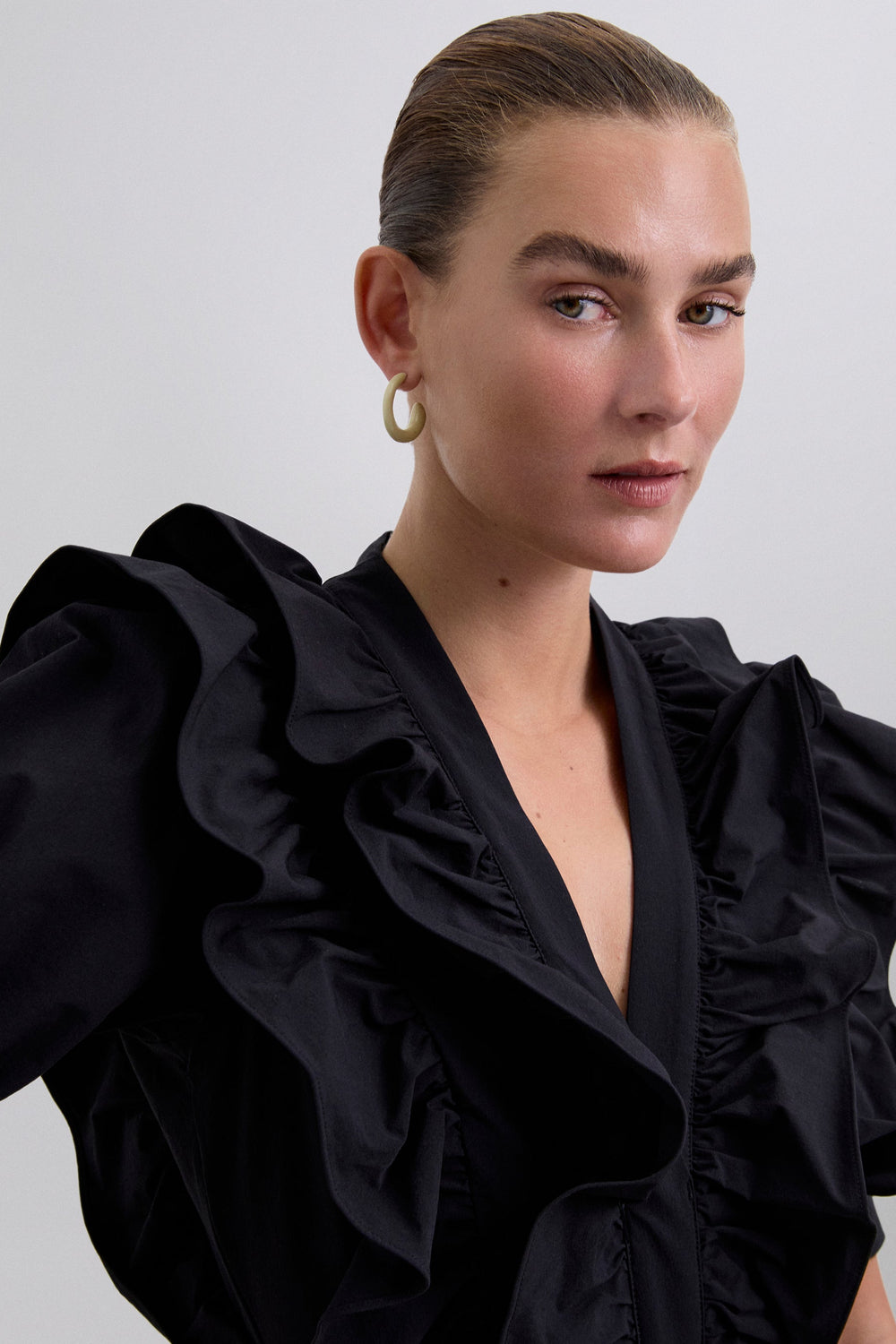 Black jumpsuit. Regular fit, V-neck with ruffle detail, puff sleeves with trim, fitted waist and full length trousers. Back zip fastening.