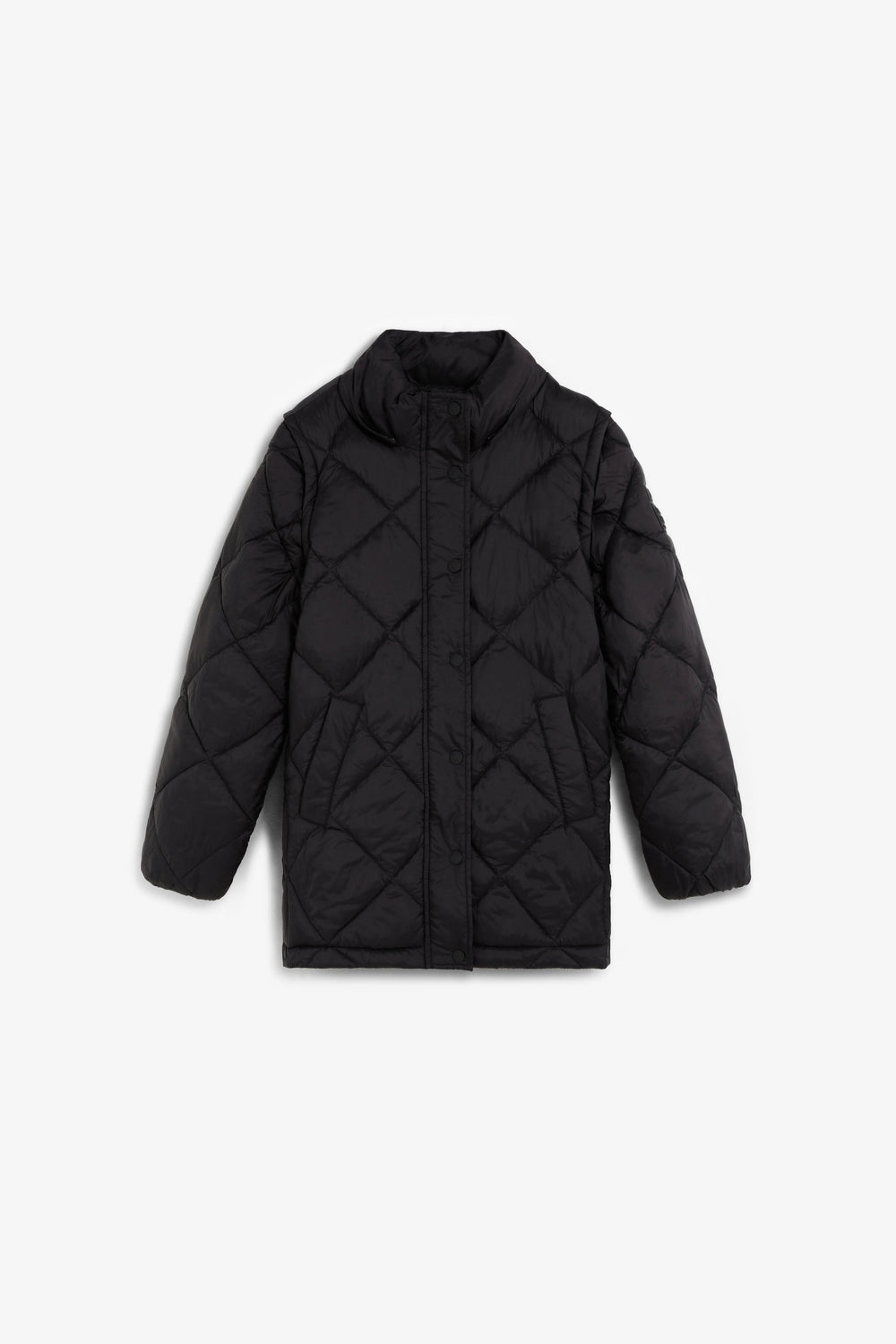 Padded coat. Detachable hood and sleeves. Front zip fastening concealed by placket with press stud fastening. Side pockets. Recycled fleece lining. Logo detail on the back.