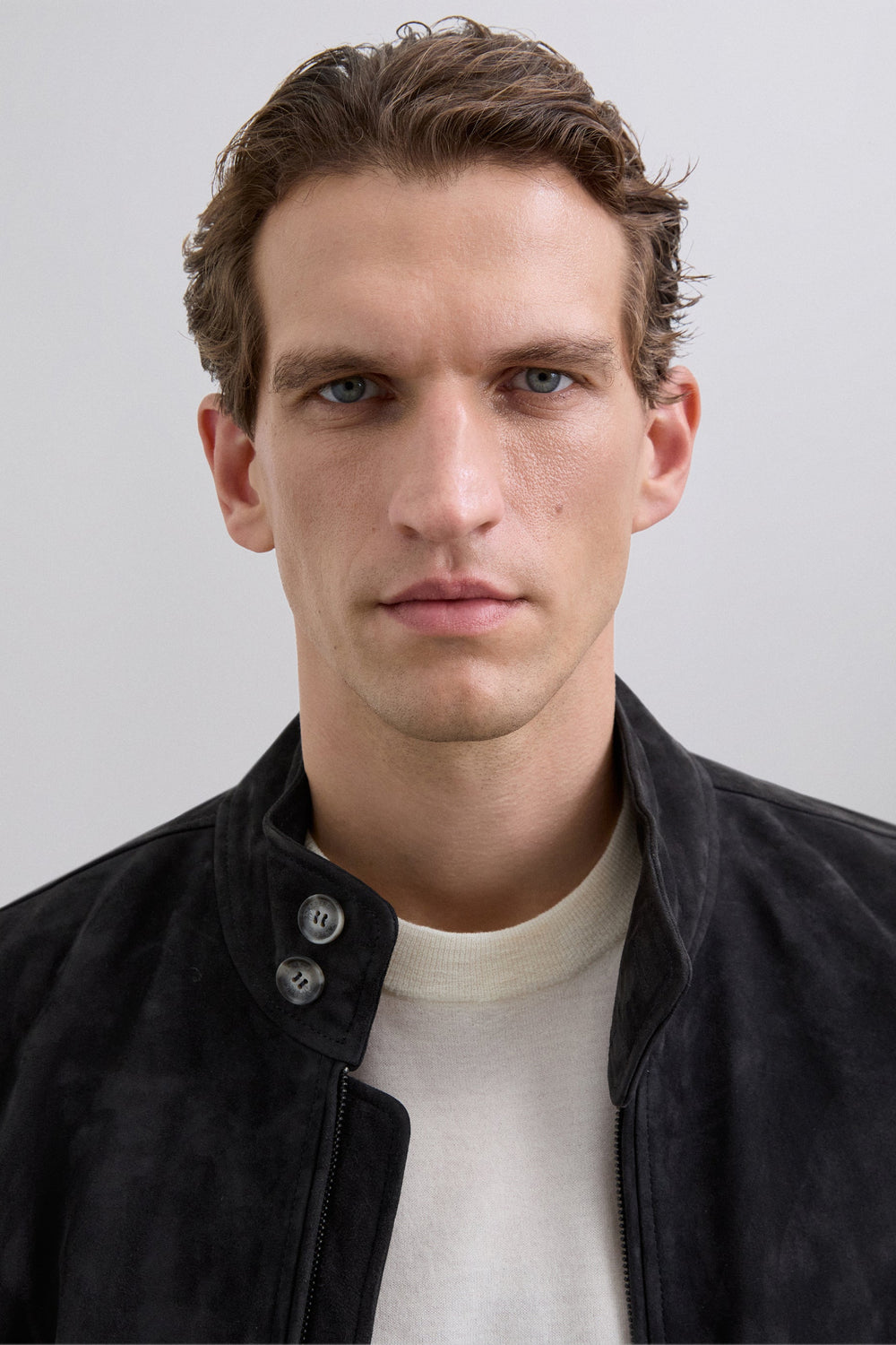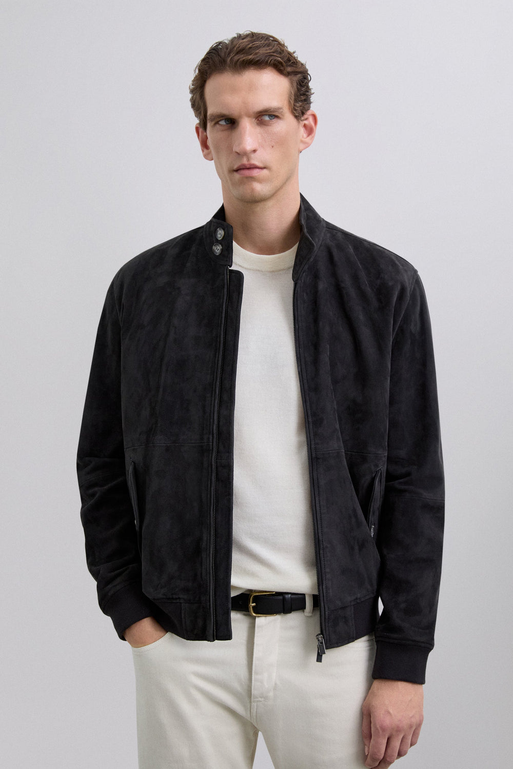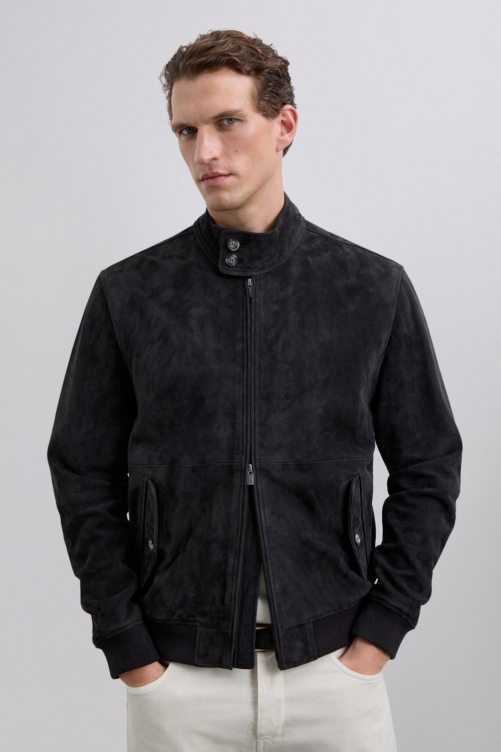 100% goatskin jacket. Fitted. Two-way zip. Ribbed collar, cuffs and waistband. Two front pockets with button fastening. Two button fastening collar.