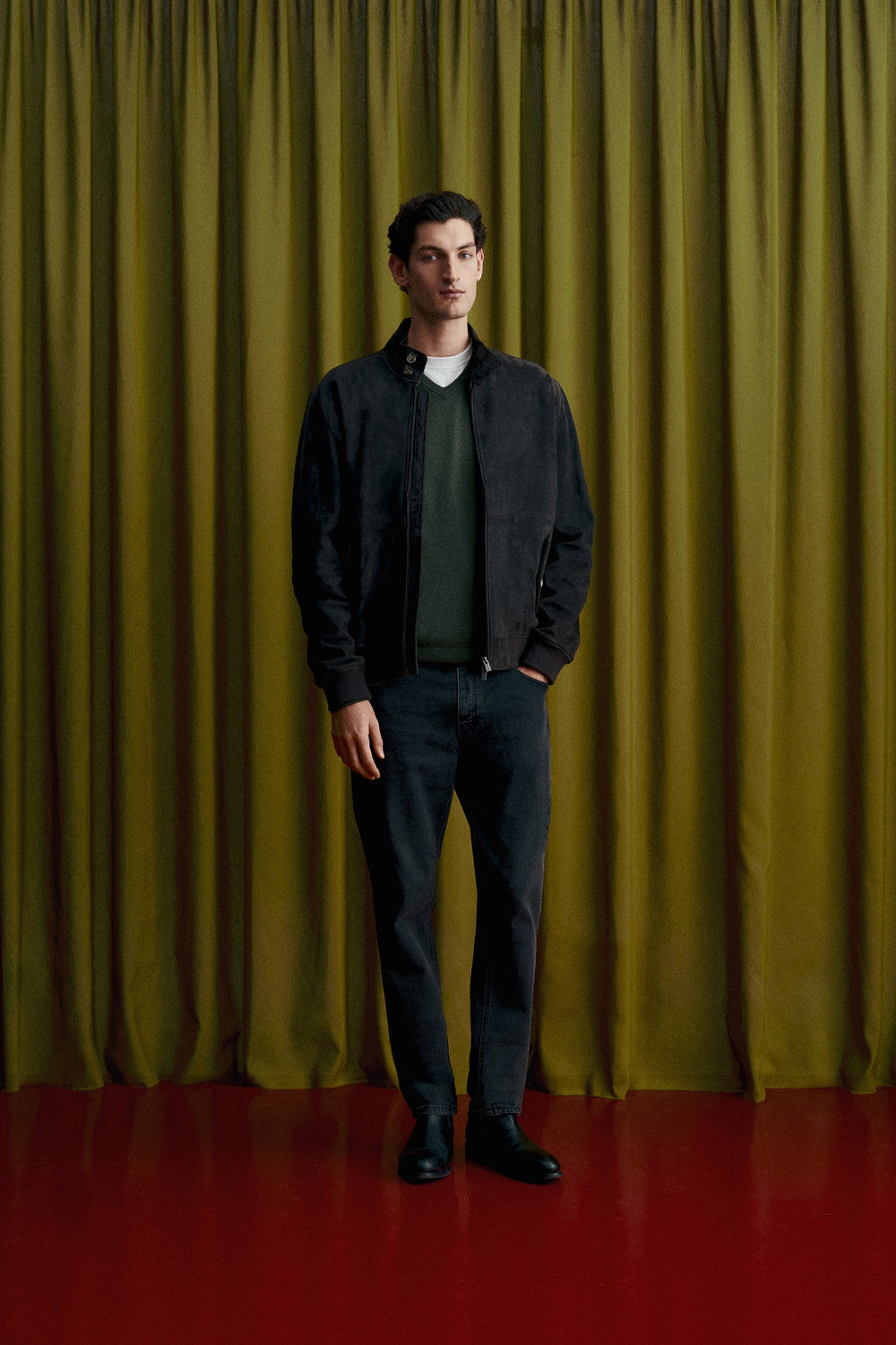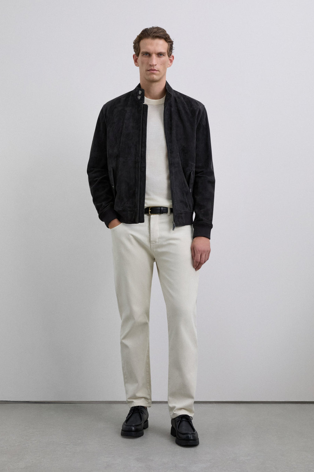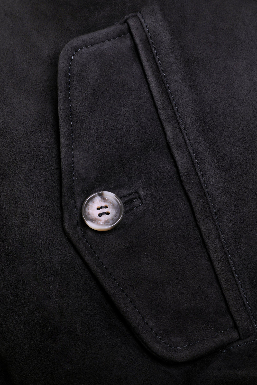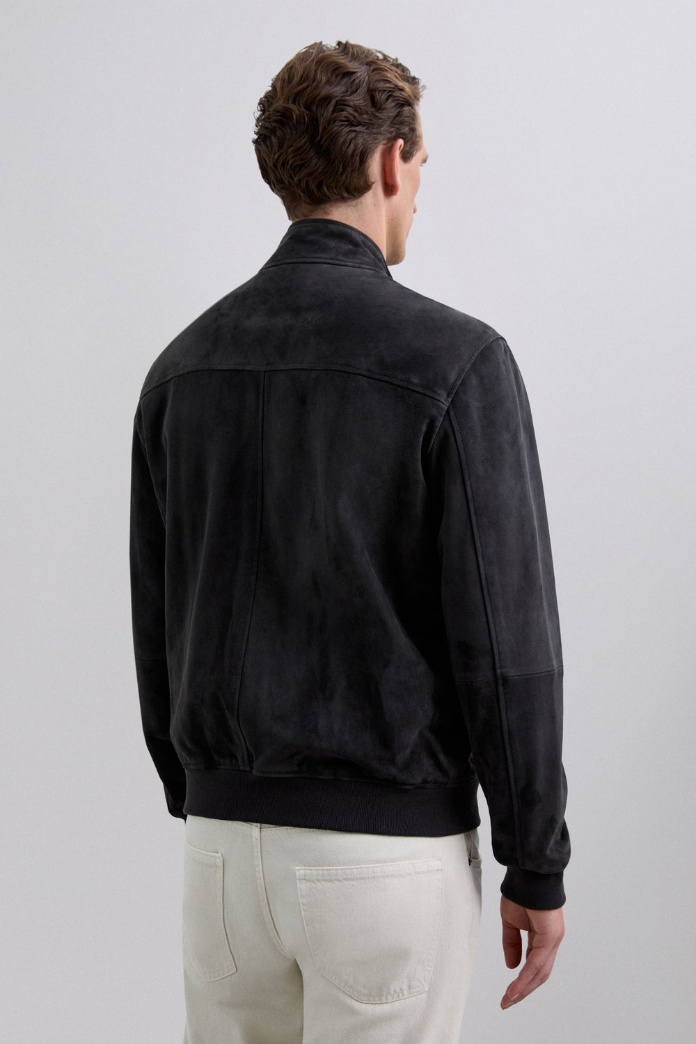 100% goatskin jacket. Fitted. Two-way zip. Ribbed collar, cuffs and waistband. Two front pockets with button fastening. Two button fastening collar.